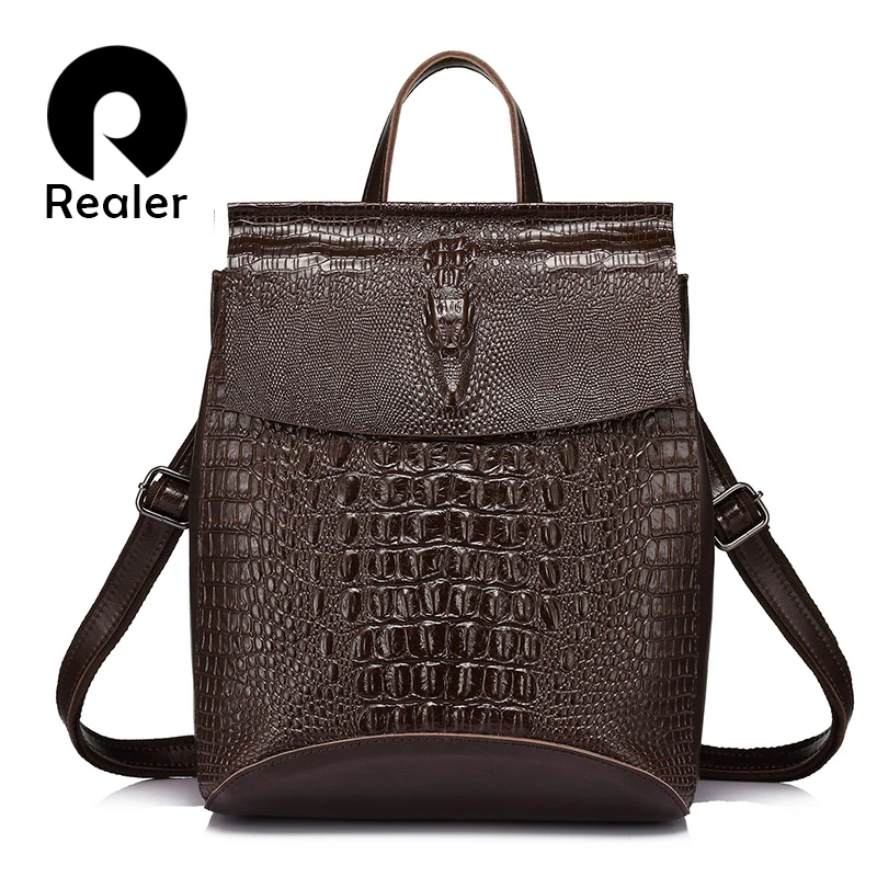 Promo REALER Brand fashion women backpack high quality split leather shoulder bag female crocodile prints